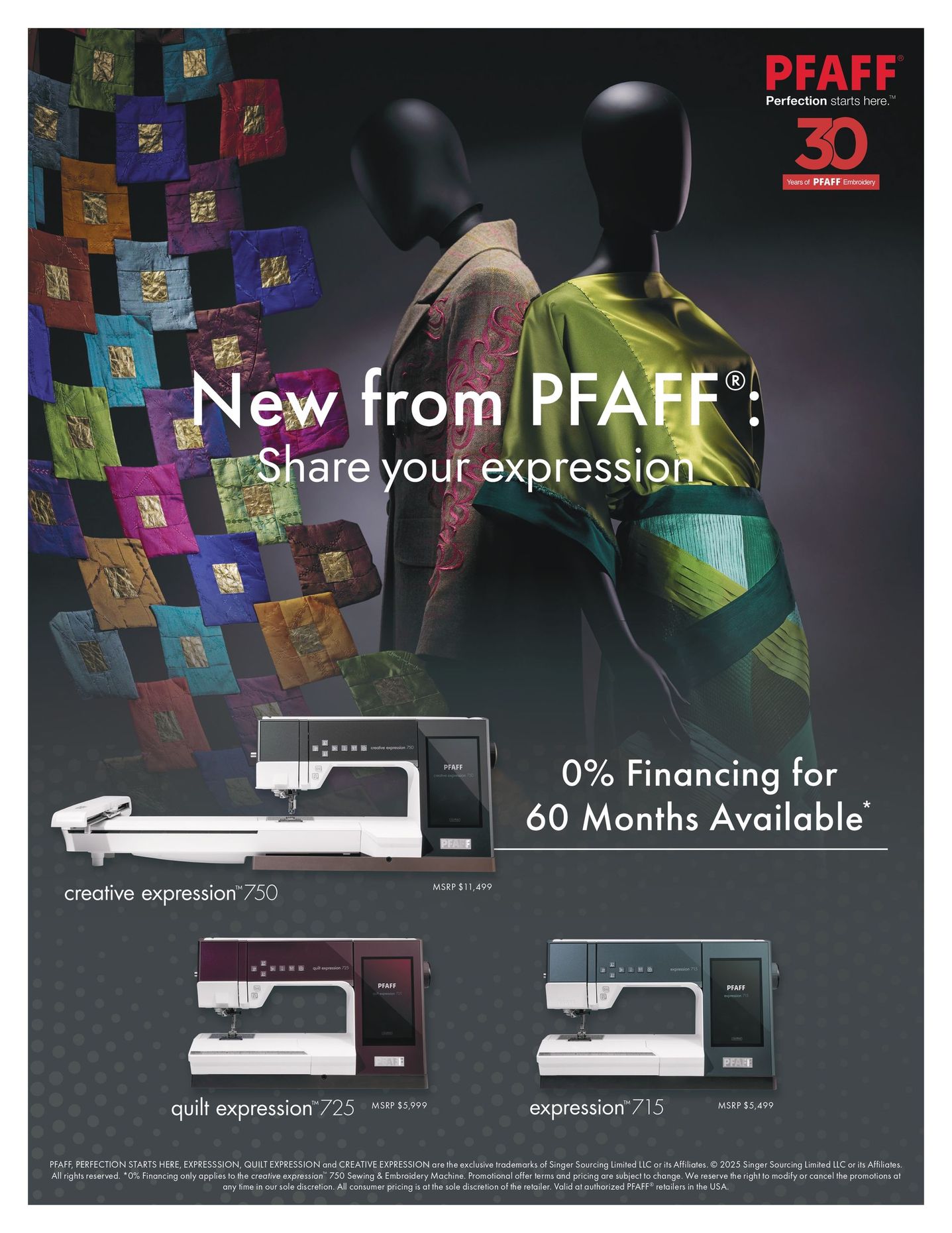 Unleash your creativity with the all-new Pfaff® Expression™ line—a perfect blend of precision engineering, modern innovation, and timeless design. Whether you’re crafting everyday projects, quilting with artistry, or seeking a special edition that stands out, these machines deliver the performance, versatility, and style that sewists demand.